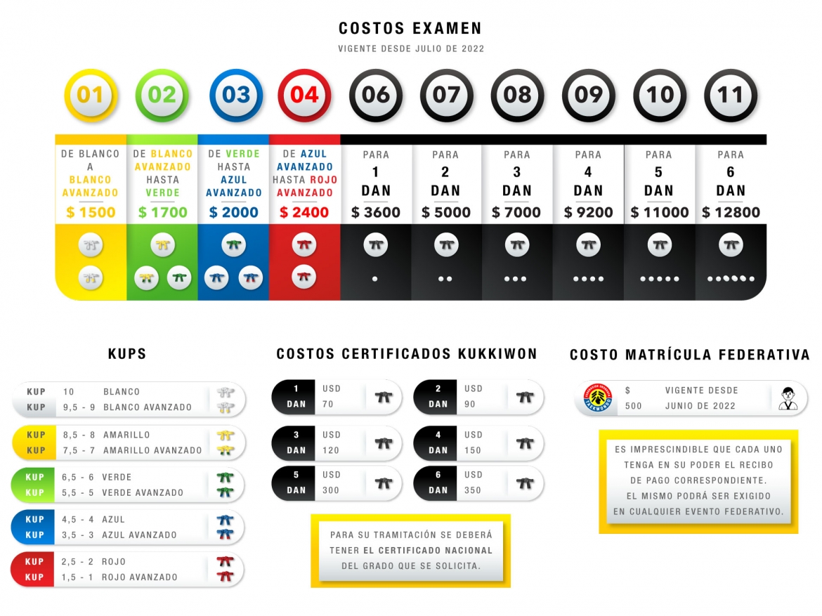 Costos examen de pasaje de grado, certificado de Kukkiwon y matrícula federativa anual.